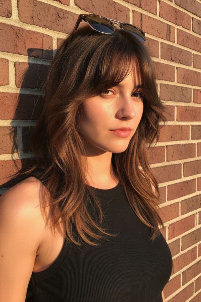 It’s the kind of look that feels natural yet full of style — relaxed enough for every day but still striking in photos. The bangs fall gently around the face, adding just the right amount of mystery and charm.